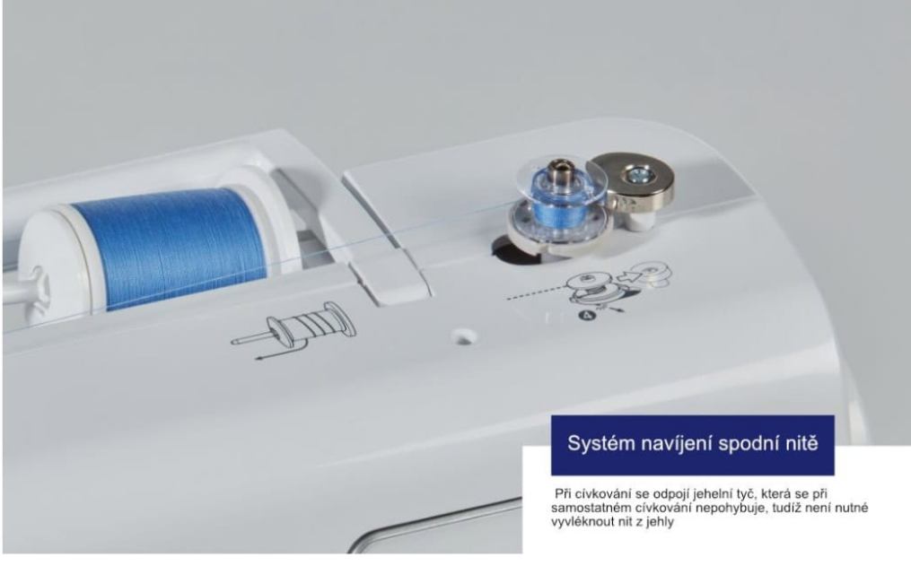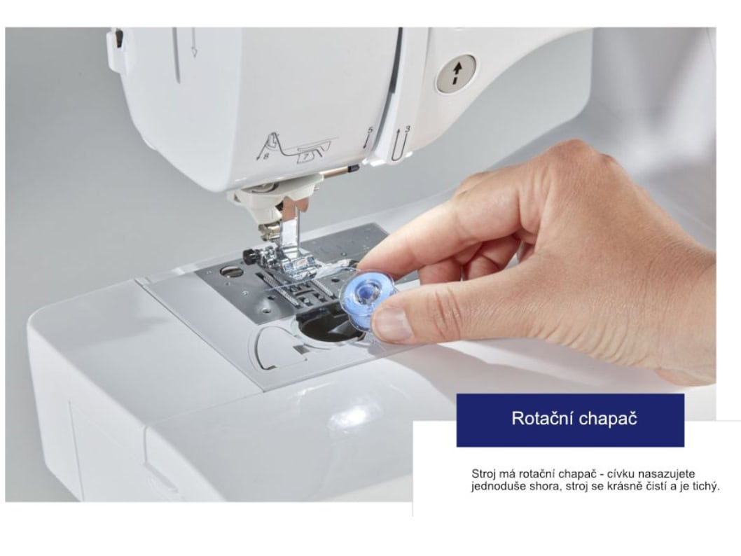 Cívku vloží hravě i začátečník, navíc je stroj díky tomuto chapači tichý