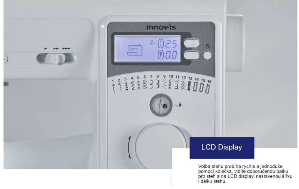 Na displeji vidíte zvolená druh stehu, jeho délku a šíř