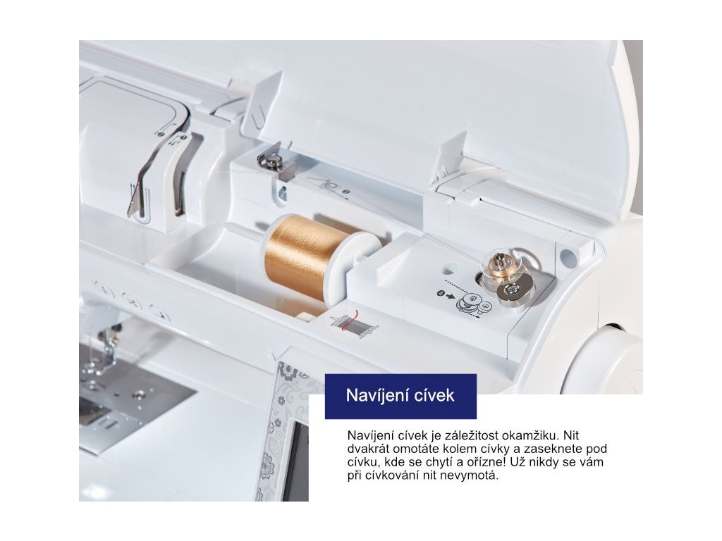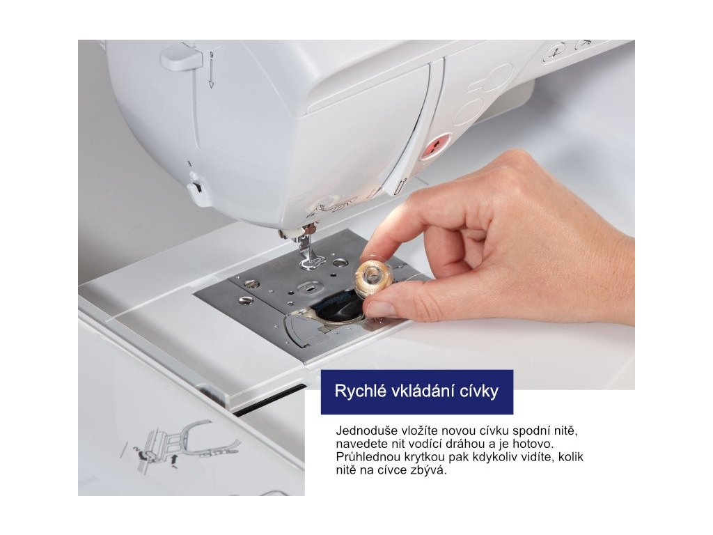 - čidlo přetržení horní nitě, kontrola prázdné cívky spodní nitě