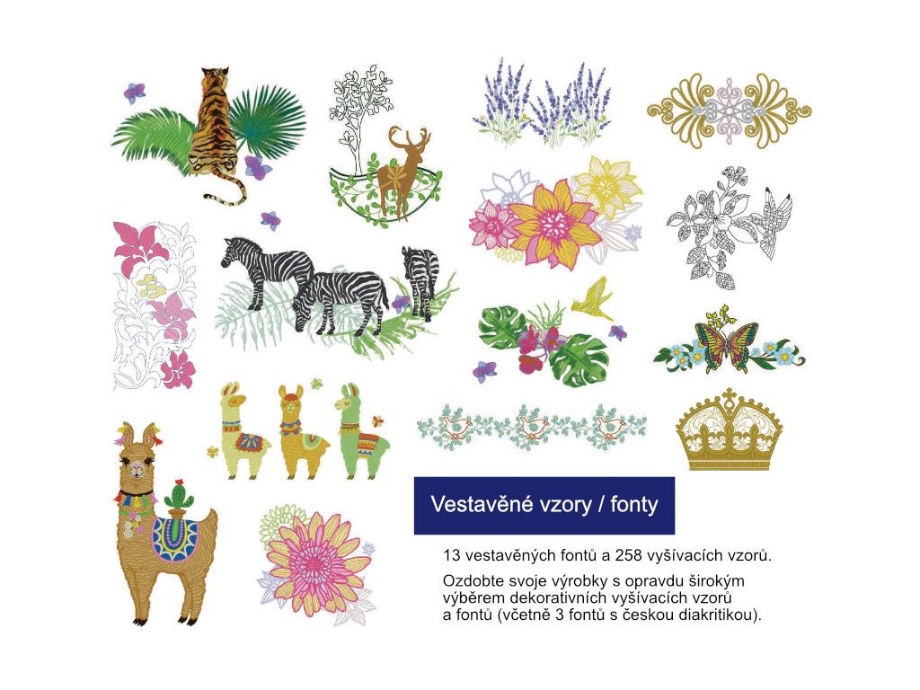Stroj nabízí 258 vyšívacích vzorů v paměti stroje, 140 druhů orámování v paměti stroje,13 fontů písma (9 evropských druhů písma, 1 azbuka a 3 japonské fonty).