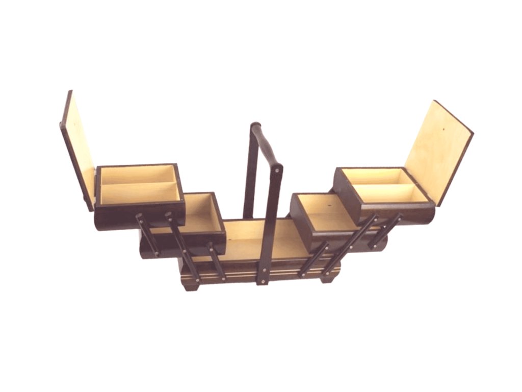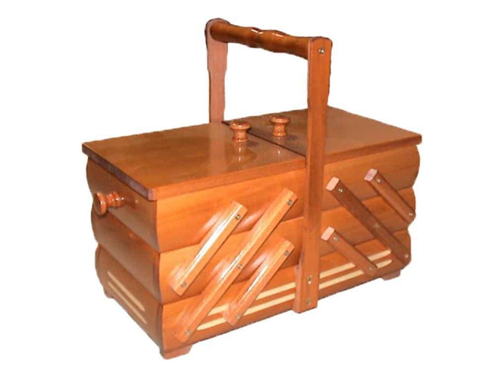Kvalitní dřevěná rozkládací kazeta na šicí potřeby s bytelným madlem. Madlo kazety nejde sklopit. Díky svému členění do pěti oddělených prostorů, umožňuje přehledné uložení šicích potřeb. Rozměry: šířka 34 cm, hloubka 18 cm, výška 27 cm. Český výrobek.