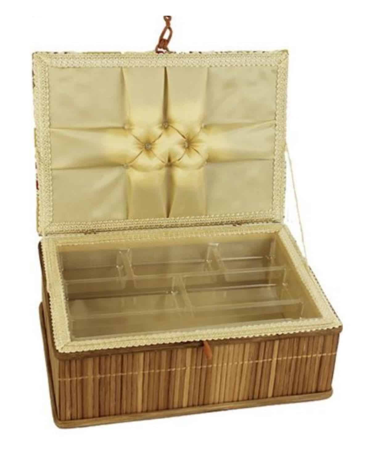 Košík na uložení šicích potřeb ze dřeva, bambusu, víko má potažené dekorativní látkou. Uvnitř má kazeta plastovou vyndavací přihrádku, díky které úhledně uspořádáte všechny drobnosti na šití. Na víku praktický jehelníček. Rozměry: šířka 28 cm, hloubka 20 cm, výška 11 cm. Cena za 1 kus. Kvalitní český výrobek.