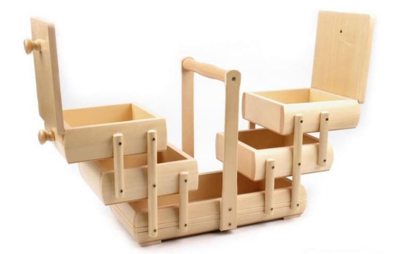 Kvalitní dřevěná rozkládací kazeta na šicí potřeby s bytelným madlem, která je na víkách zdobená vypalováním. Madlo nejde sklopit, je přidělané napevno. Kazeta je členěná do pěti oddělených prostor, to umožňuje přehledné roztřídění a uložení šicích potřeb. Rozměry kazety: šířka 32 cm, hloubka 18 cm, výška 26 cm.