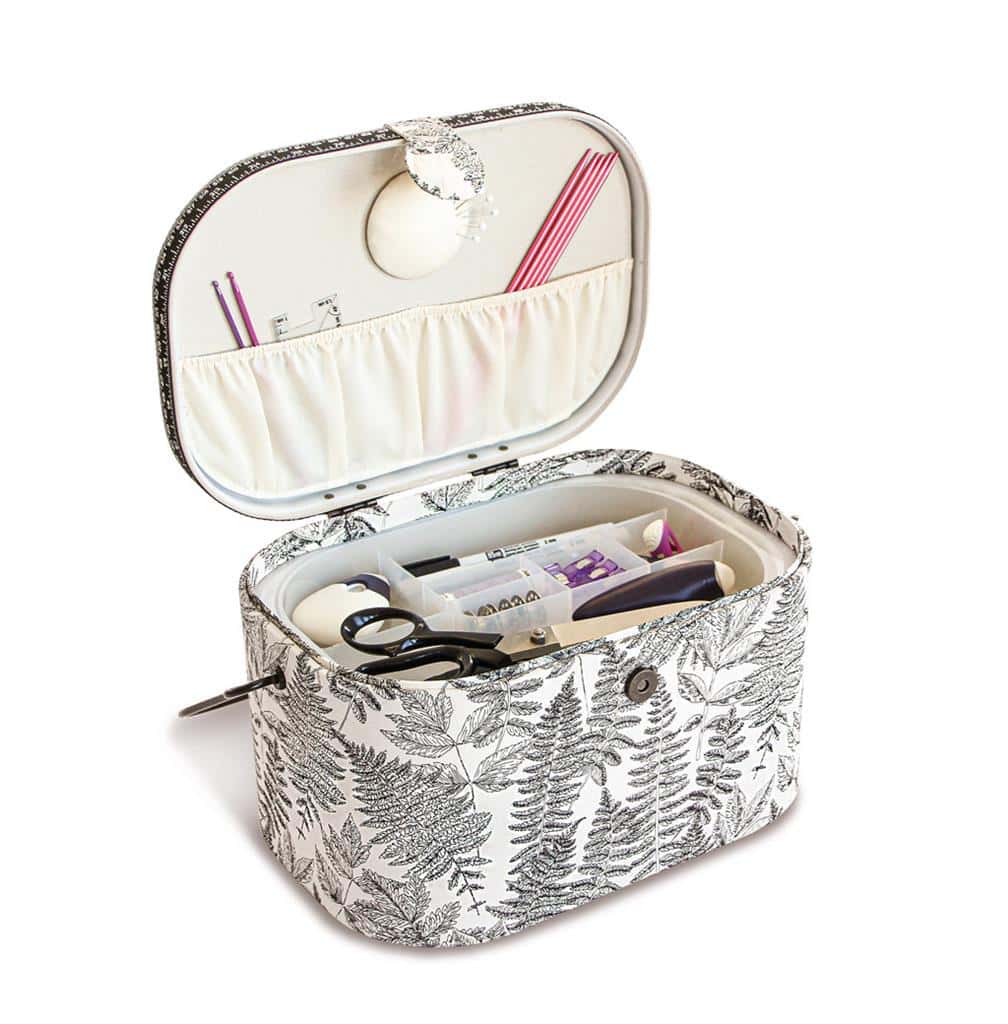 Kvalitní velký čalouněný košík značky Prym potažený látkou s jemným vzorem. Košík má horní vyjímatelné plastové patro, které má jednu velkou a šest malými přihrádek, do kterých přehledně roztřídíte všechny drobnosti. Ve spodní části kazety je dostatečný prostor pro ukládání různých potřeb na šití, patchwork nebo vyšívání. Na vnitřní straně víka jsou 2 textilní kapsy a praktický kulatý jehelníček. Košík se zapíná na magnet. Polohovatelné kovové madlo má dřevěnou tvarovanou rukojeť, aby se kazeta pohodlně přenášela. Kazeta se prodává bez výbavy, pouze ilustrativní foto!
