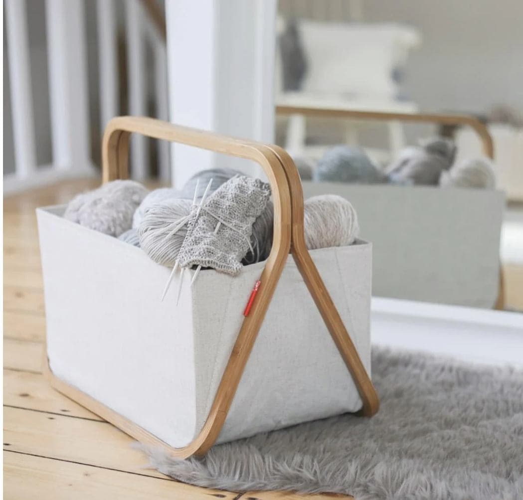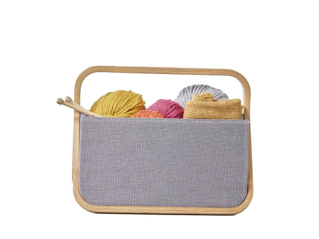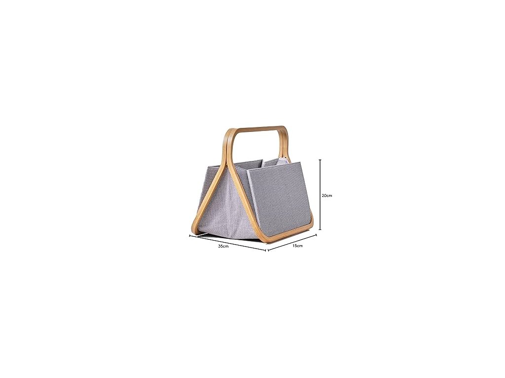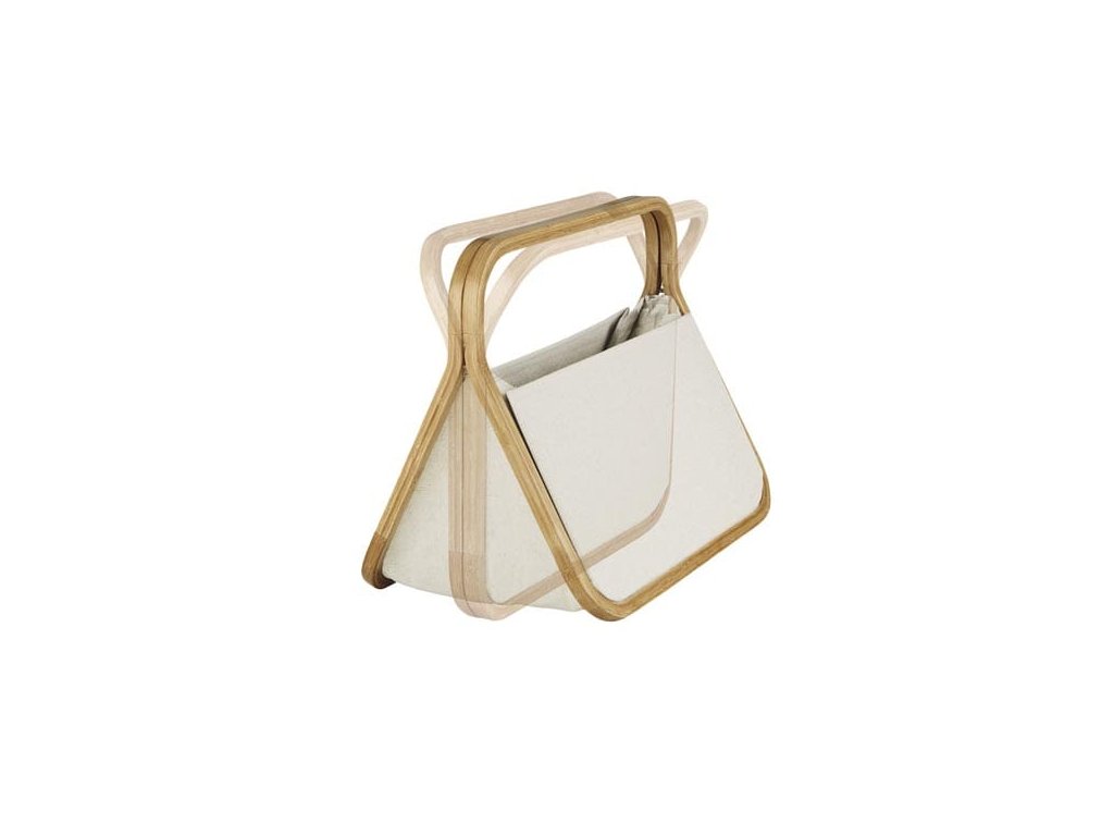 Designový skládací koš pro ukládání pletacích pomůcek, rozpracovaných projektů nebo časopisů a novin. Je vyrobený z pevného přírodního plátna a lehkého bambusu. Má zesílené dno a boky, proto hezky drží tvar. V případě potřeby můžete koš snadno složit a uskladnit. Čínský výrobek. Koš se prodává prázdný, bez výbavy, pouze ilustrační foto.