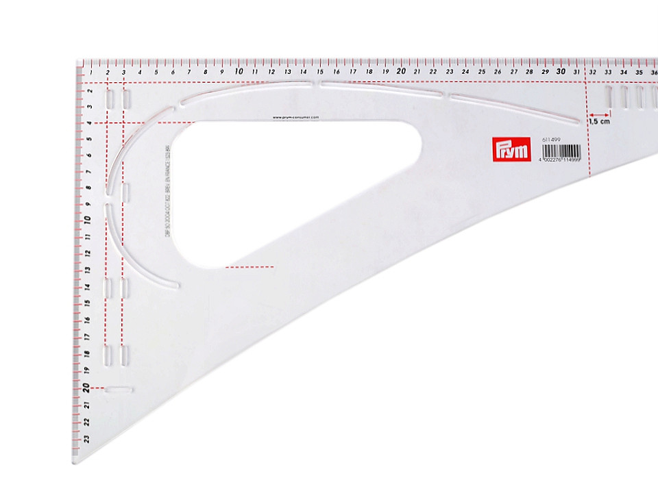 Pravítko má vyznačené souběžné čáry na záložky 1, 2, 3 a 4 cm. Zakřivení na tvorbu rukávů a průkrčníků.