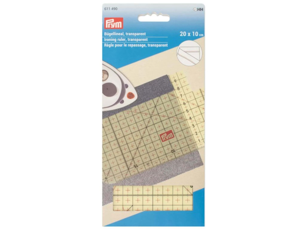 Univerzální transparentní žehlící měřítko značky Prym, díky kterému rychle a přesně vytvoříte záložky, sklady, nebo zkrátíte nohavice či rukávy.