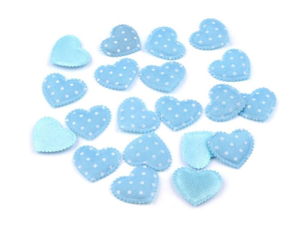 Pátková srdíčka z polyesteru. Světle modrá s bílými puntíky. Rozměr 17 x 20 mm. Cena za kus.