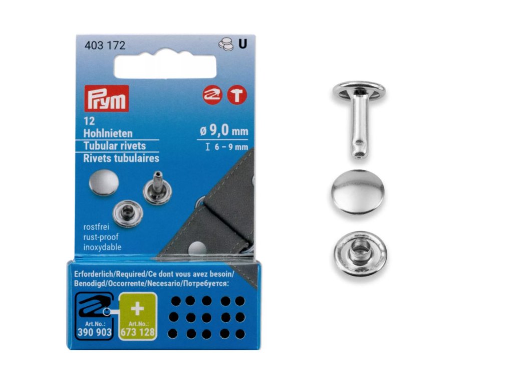 Nerezavějící duté nýty pro materiály o tloušťce 6 - 9 mm. Průměr hlavičky nýtu je 9 mm. Balení obsahuje 12 kusů. Můžete aplikovat pomocí lisu Vario Creative a kleští Vario, ke kterým musíte mít sadu nástavců pro aplikaci dutých nýtů. Duté nýty jsou vhodné na kůži, silnější tkaniny (s tloušťkou 6 - 9 mm) např. na kabelky, tašky, opasky.
