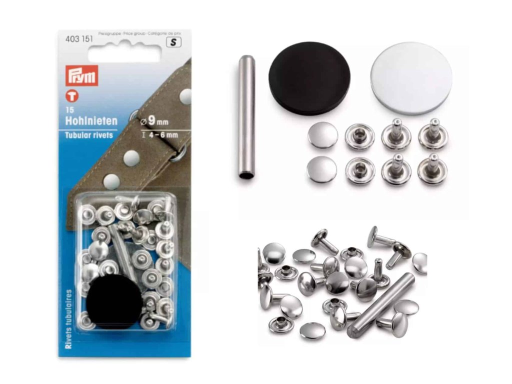 Nerezavějící duté nýty pro tenčí materiály o tloušťce 4-6 mm. Průměr hlavičky nýtu je 9 mm. V balení je 15 kusů nýtů. Můžete aplikovat pomocí kladiva a nýtovacích přípravků, které jsou součástí balení nebo pomocí lisu Vario Creative a kleští Vario. Duté nýty jsou vhodné na kůži a silnější tkaniny (s tloušťkou 4 - 6 mm) např. na kabelky, tašky a opasky.