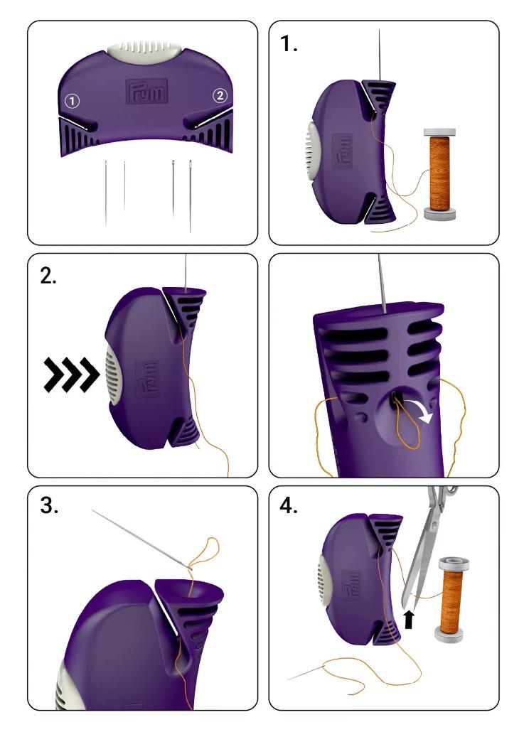 Velmi užitečný pomocník pro snadné navlékání všech druhů ručních jehel. Oceníte ho zejména při omezené jemné motorice, zhoršeném zraku, nedostatečném osvětlení nebo při práci s velmi tenkými jehlami. Navlékač pohodlně padne do ruky a můžete ho ovládat i při postavení na stole. Vhodný pro šicí, quiltovací, gobelínové i látací jehly. Otvor 1 je určen pro jemné jehly o průměru 0,48–0,80 mm, zatímco otvor 2 je vhodný pro běžné jehly o průměru 0,78–1,04 mm. Rozměry: 54 × 25 × 86 mm. Čínský výrobek, cena za 1 ks.