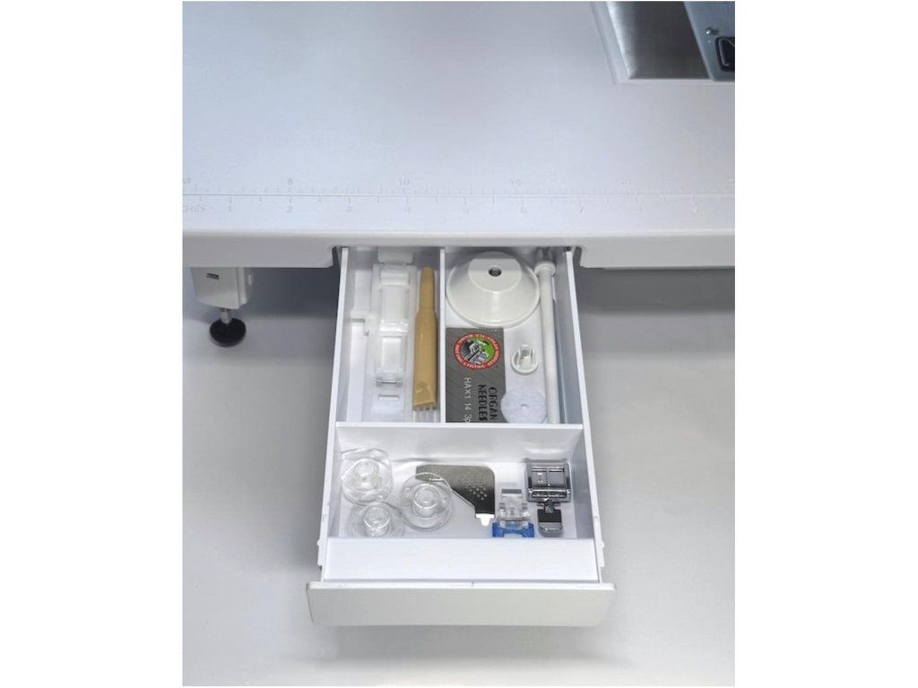Všechny nezbytnosti ke stroji uložíte přehledně do velké schránky.