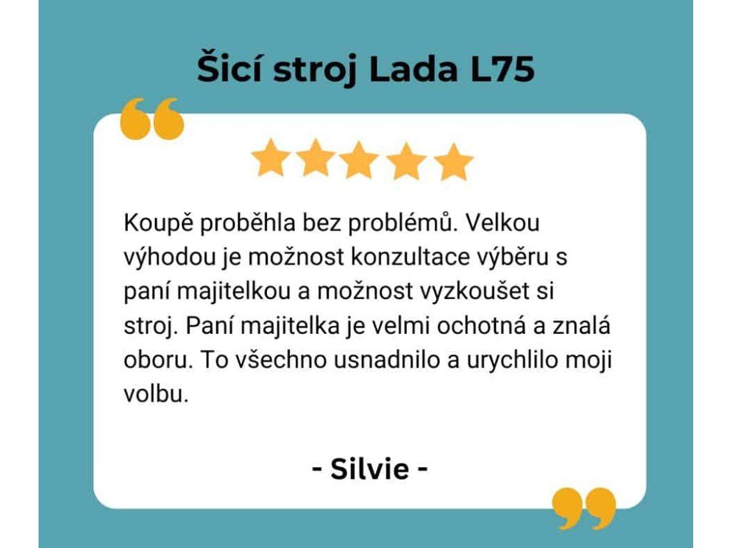 Elektronický šicí stroj Lada L75 je vhodný nejen pro zkušené švadleny, ale i pro začátečníky. Má velmi jednoduchou intuitivní obsluhu a přiložený papírový návod s mnoha podrobně popsanými obrázky. Dlouhá životnost stroje je zajištěna kvalitní celokovovou konstrukcí těla stroje a všech důležitých součástí, díky tomu má stroj tichý chod.