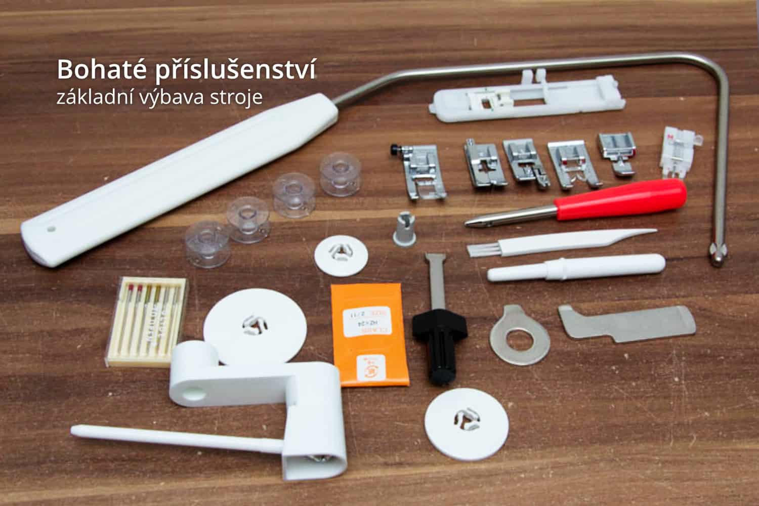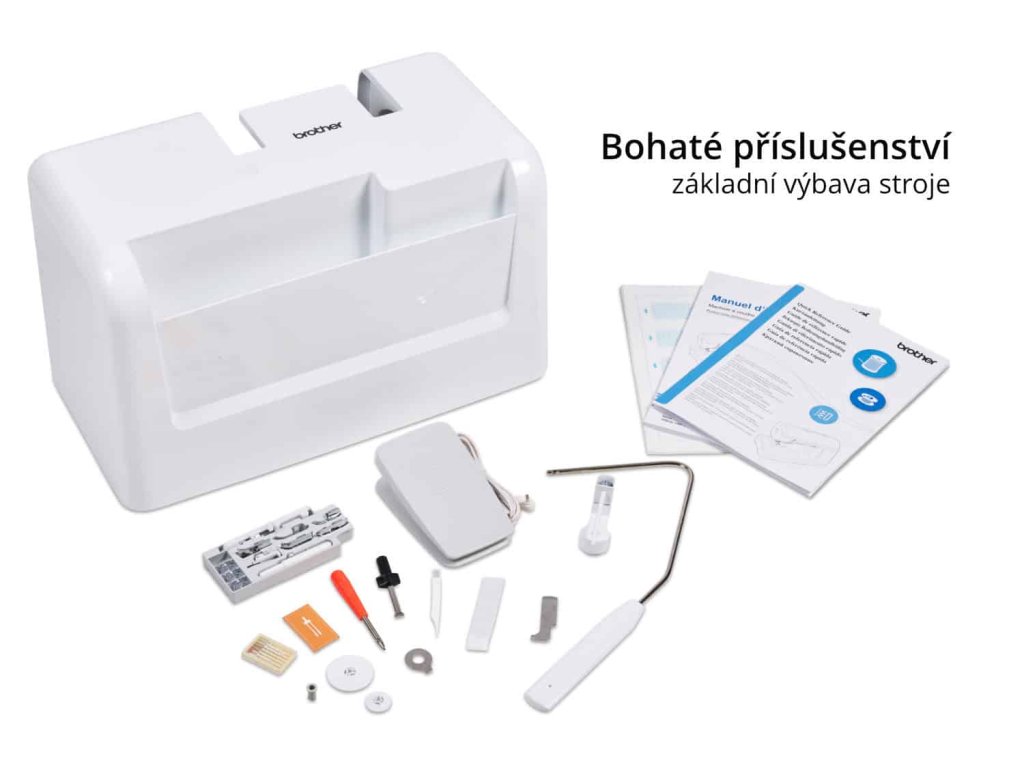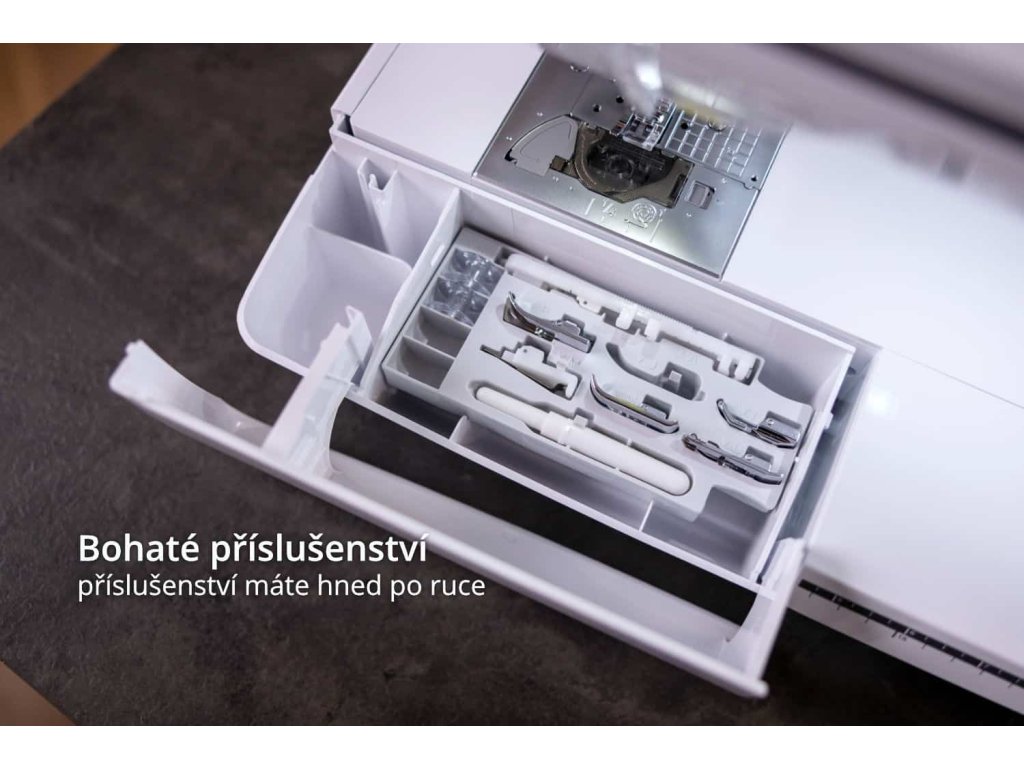 Ke stroji dostanete opravdu bohaté příslušenství: 7 přídavných patek, kolenní páku, nástavec pro dvojjehlu, pevný kryt a další.