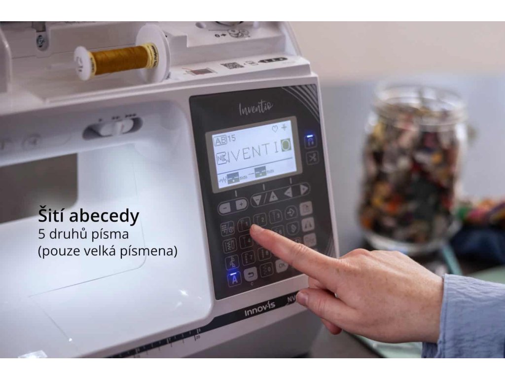 Stroj má mnoho tipů stehů, různé fonty písmen a číslic, ozdobné stehy, knoflíkové dírky