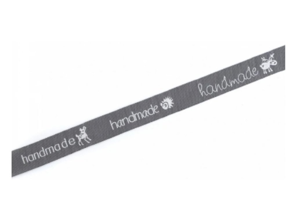 Vzorovka s nápisem hand made a obrázky zvířátek - srnka, ježek, sob, žába, které se pravidelně střídají. Na dotek je jemná a neškrábe, proto je ideální na vytvoření štítků na ručně šité výrobky. Můžete prát v pračce na 40°C. Složení 100% polyester. Šíře 16 mm. Cena za metr.